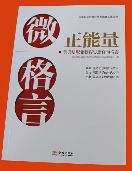 德陽(yáng)市千山街三段87號(hào)近日,由中華職業(yè)教育社黃炎培職業(yè)教育思想百句格言評(píng)選活動(dòng)主委會(huì)編寫(xiě)的《微格言 · 正能量》一書(shū)出版發(fā)行。全國(guó)政協(xié)副主席、中華職業(yè)教育社理事長(zhǎng)張榕明,民建中央常委、中華職業(yè)教育社理事、中華同心溫暖工程基金會(huì)副理事長(zhǎng)蘇華,中國(guó)國(guó)土資源作家協(xié)會(huì)副主席、中國(guó)土地學(xué)會(huì)文化分會(huì)副主任周偉分別為該書(shū)作序。